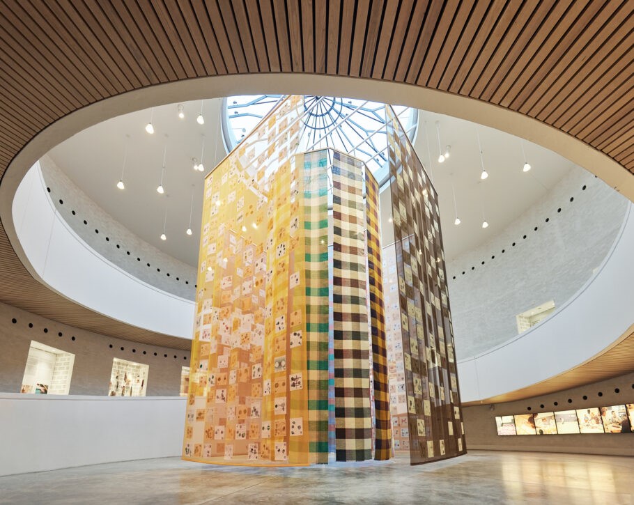 The final artwork, DATA MIRROR comprises a gigantic cylinder of 12 woven lengths. The cylinder is surrounded by four large transparent rectangular pieces of fabric filled with embroidery. The colours in the embroidery interact with the colours in the woven lengths. The woven lengths are like a map of our complex, interwoven world. Through the individual pieces of embroidery, you can zoom in on the personal pattern of each participant and their relationship to this complexity.